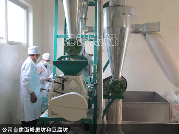 為了員工的飲食安全,配置了能容納800人同時就餐的食堂,飲用水配備了凈化自來水設施,還配置了面粉機房自己生產無害面粉,新上了豆腐生產裝置自己生產無害豆腐,還有15畝地的自產自用的綠色環保蔬菜園等。