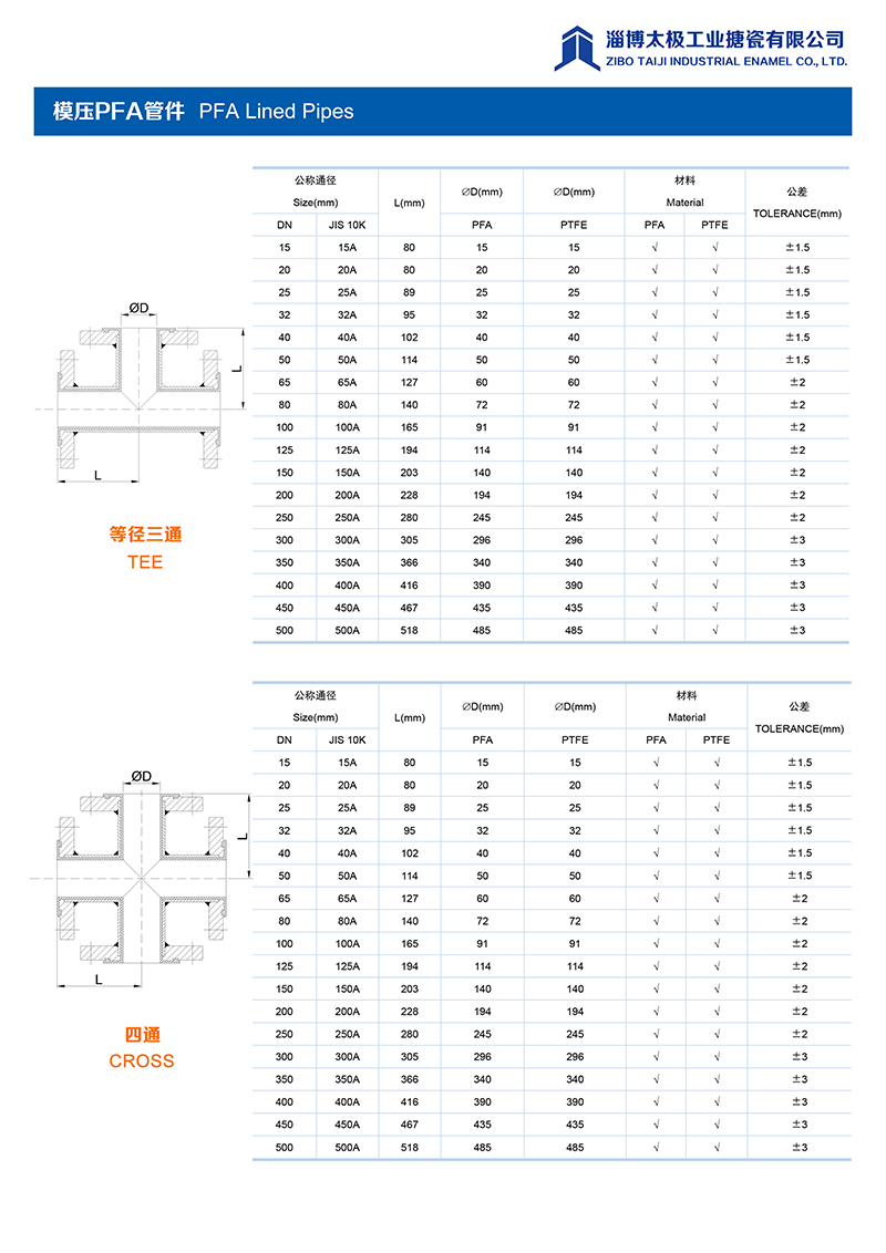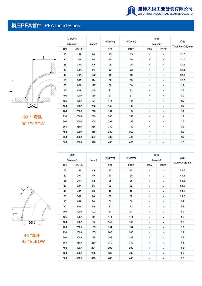 本公司的模壓PFA管件,采用耐強(qiáng)腐蝕的PFA材料,具有高密度、高強(qiáng)度和襯層厚度均勻等特點。每一個尺寸要求都精確控制,從模具加工精度到成型后的氟塑料加工精度都精益求精。