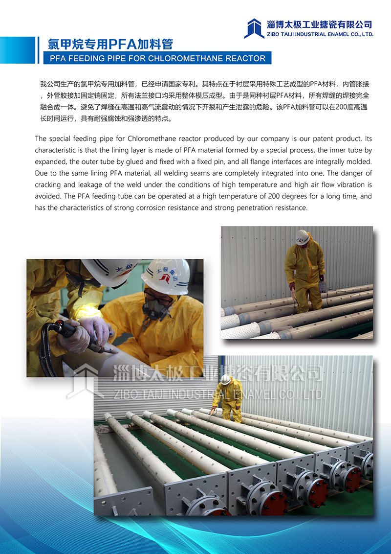 我公司生產的氯甲烷專用加料管,已經申請國家專利。其特點在于襯層采用特殊工藝成型的PFA材料,內管脹接,外管膠接加固定銷固定,所有法蘭接口均采用整體模壓成型。由于是同種襯層PFA材料,所有焊縫的焊接完全融合成一體。避免了焊縫在高溫和高氣流震動的情況下開裂和產生泄露的危險。該PFA加料管可以在200度高溫長時間運行,具有耐強腐蝕和強滲透的特點。