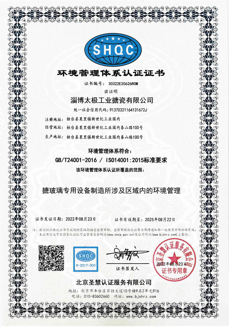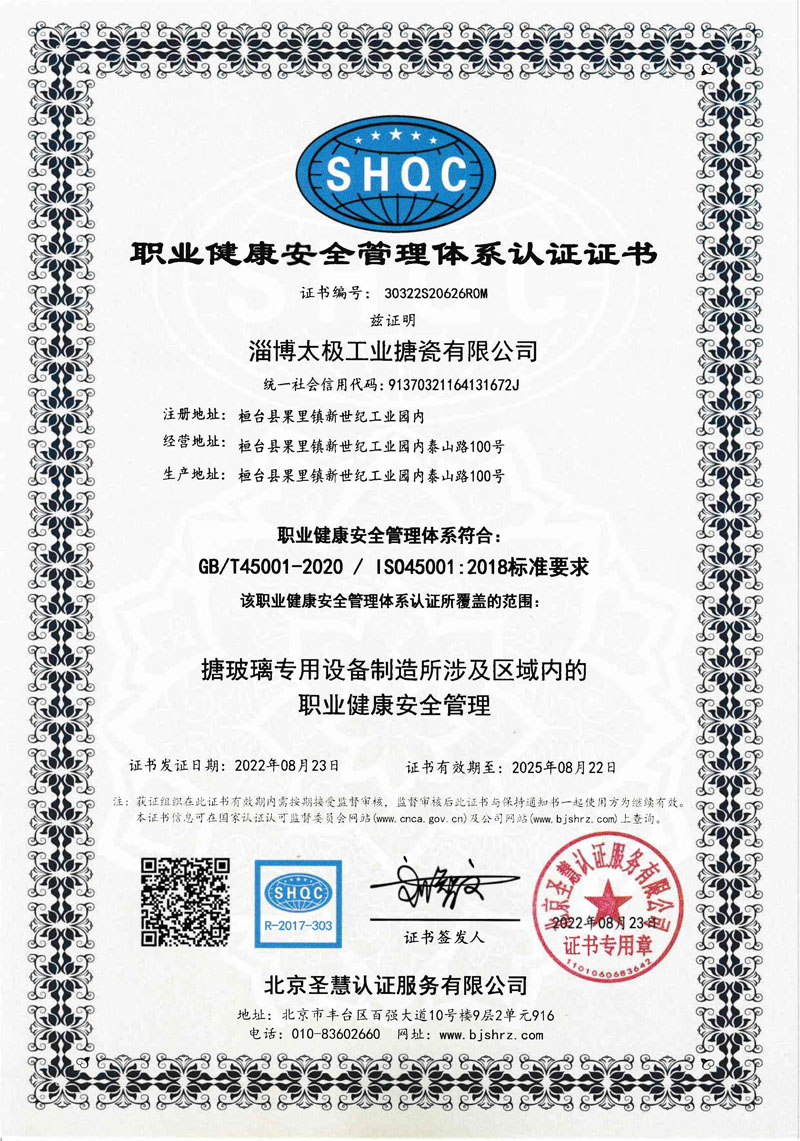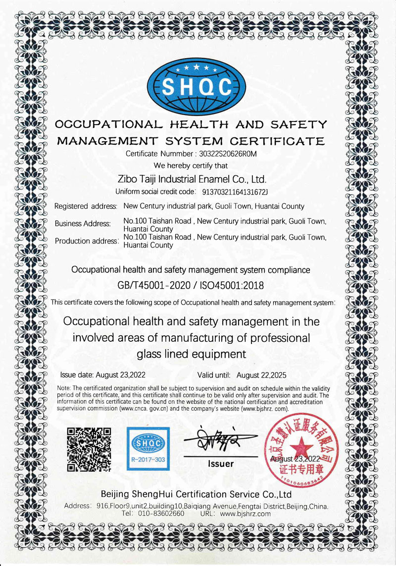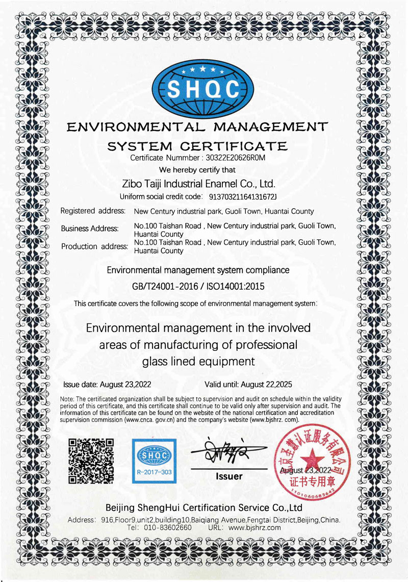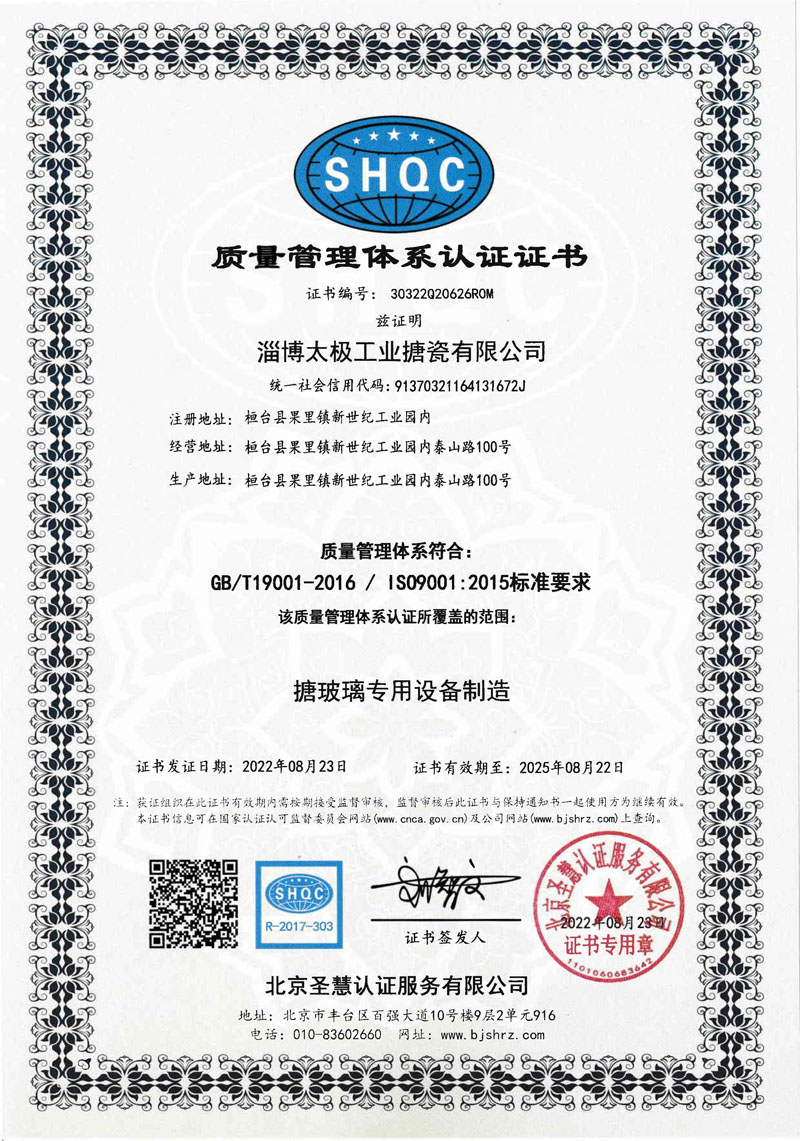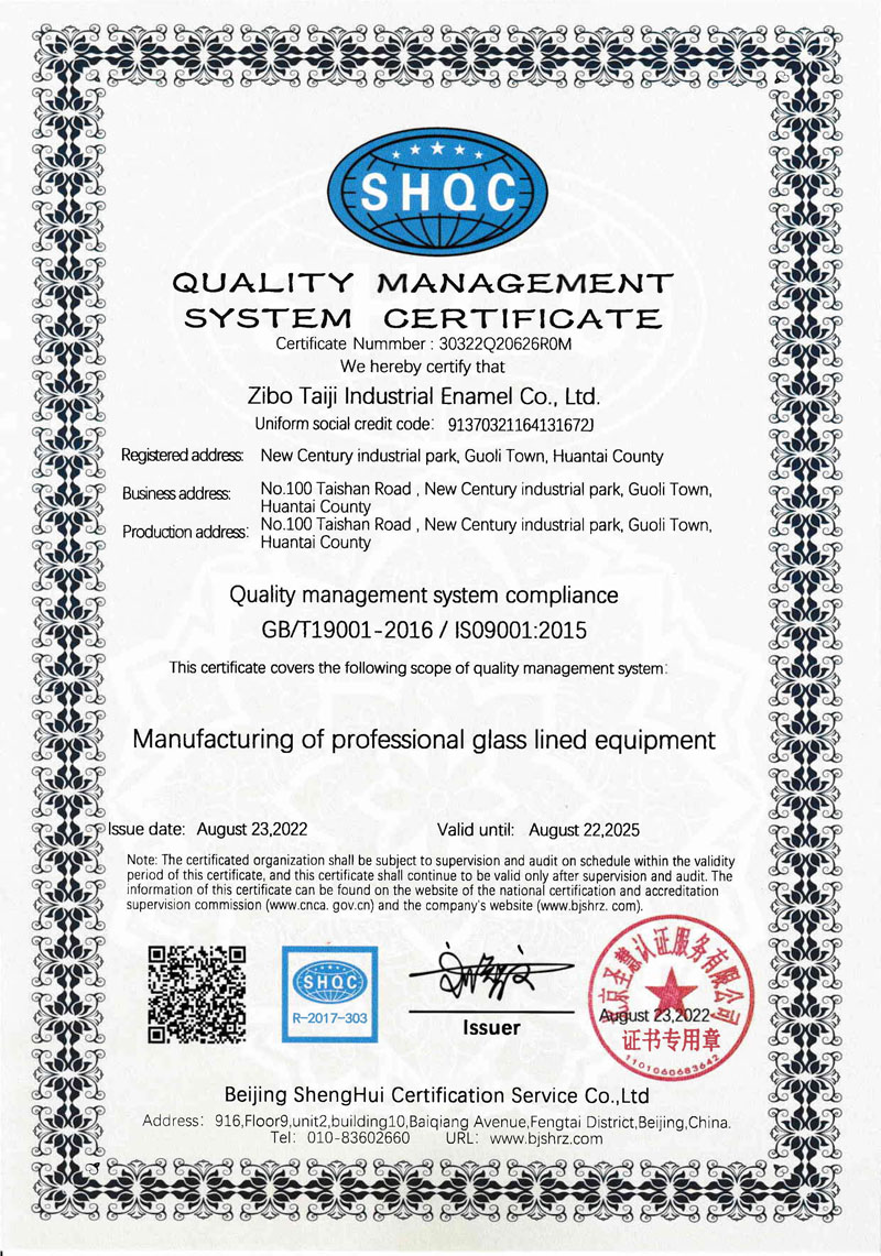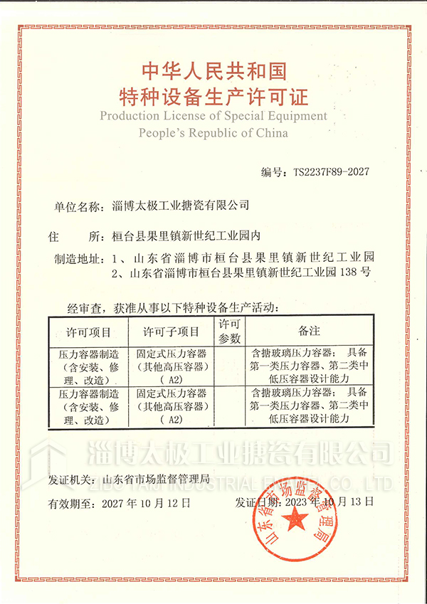 淄博太極在中國搪玻璃設備制造行業中首家通過ISO90001質量體系認證,并擁有美國ASME認證、歐洲PED認證以及國家部門頒發的搪玻璃制造許可證、進出口許可證和百余項榮譽證以及三十六項專利等。