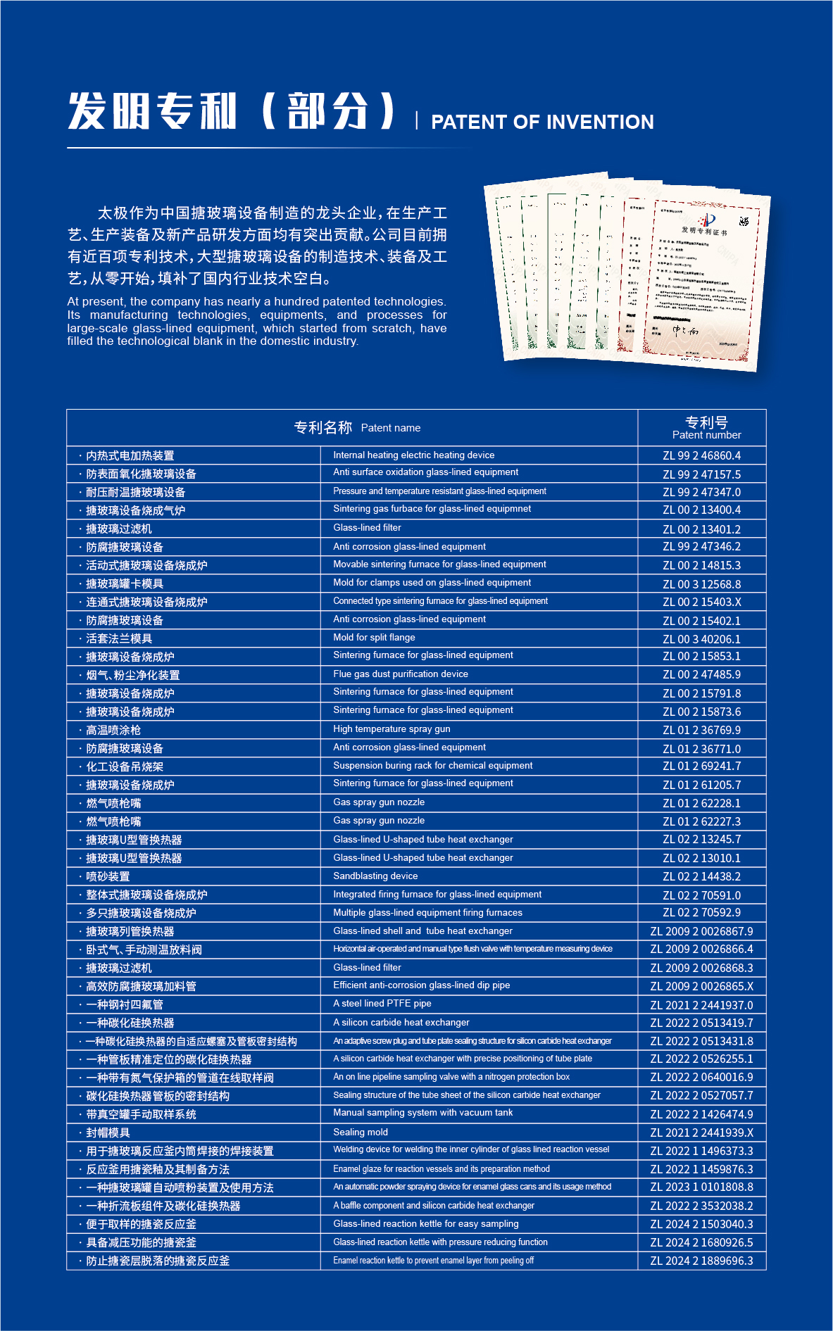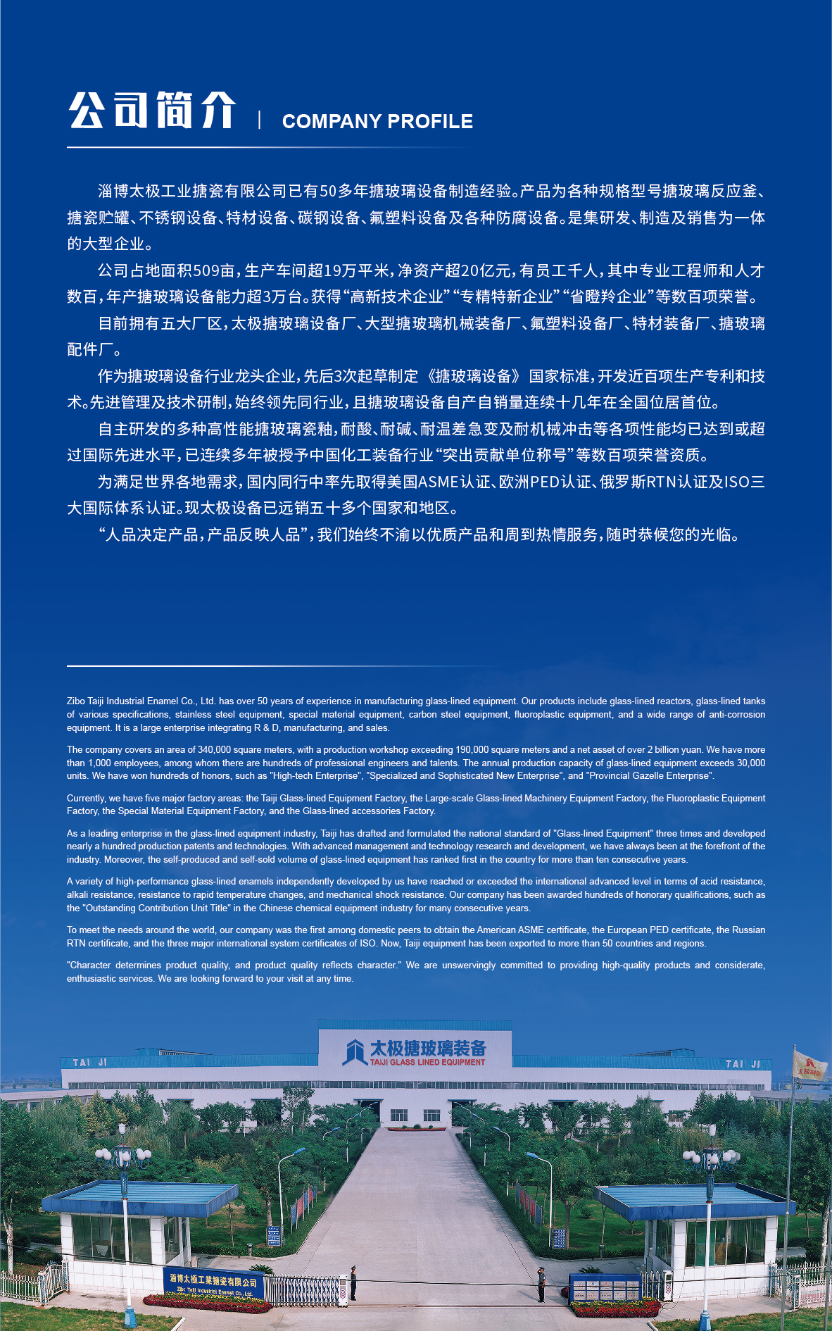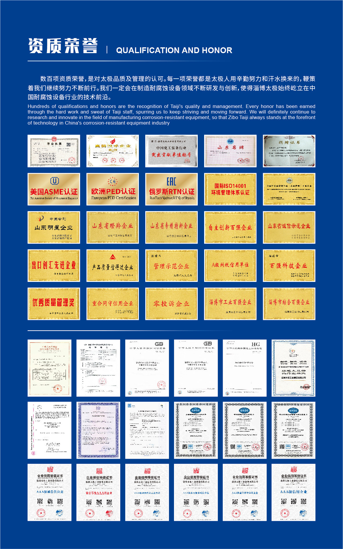 淄博太極在中國(guó)搪玻璃設(shè)備制造行業(yè)中首家通過ISO90001質(zhì)量體系認(rèn)證,并擁有美國(guó)ASME認(rèn)證、歐洲PED認(rèn)證以及國(guó)家部門頒發(fā)的搪玻璃制造許可證、進(jìn)出口許可證和百余項(xiàng)榮譽(yù)證以及三十六項(xiàng)專利等。