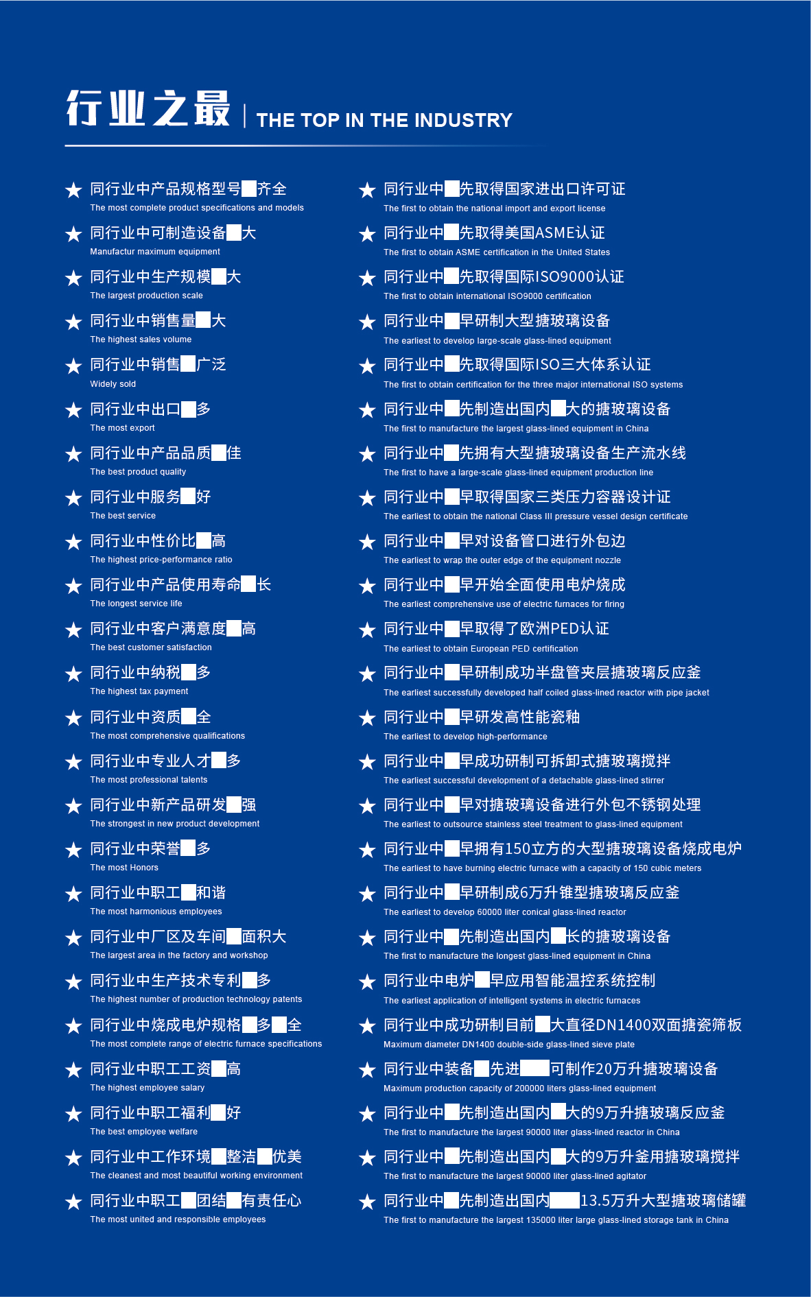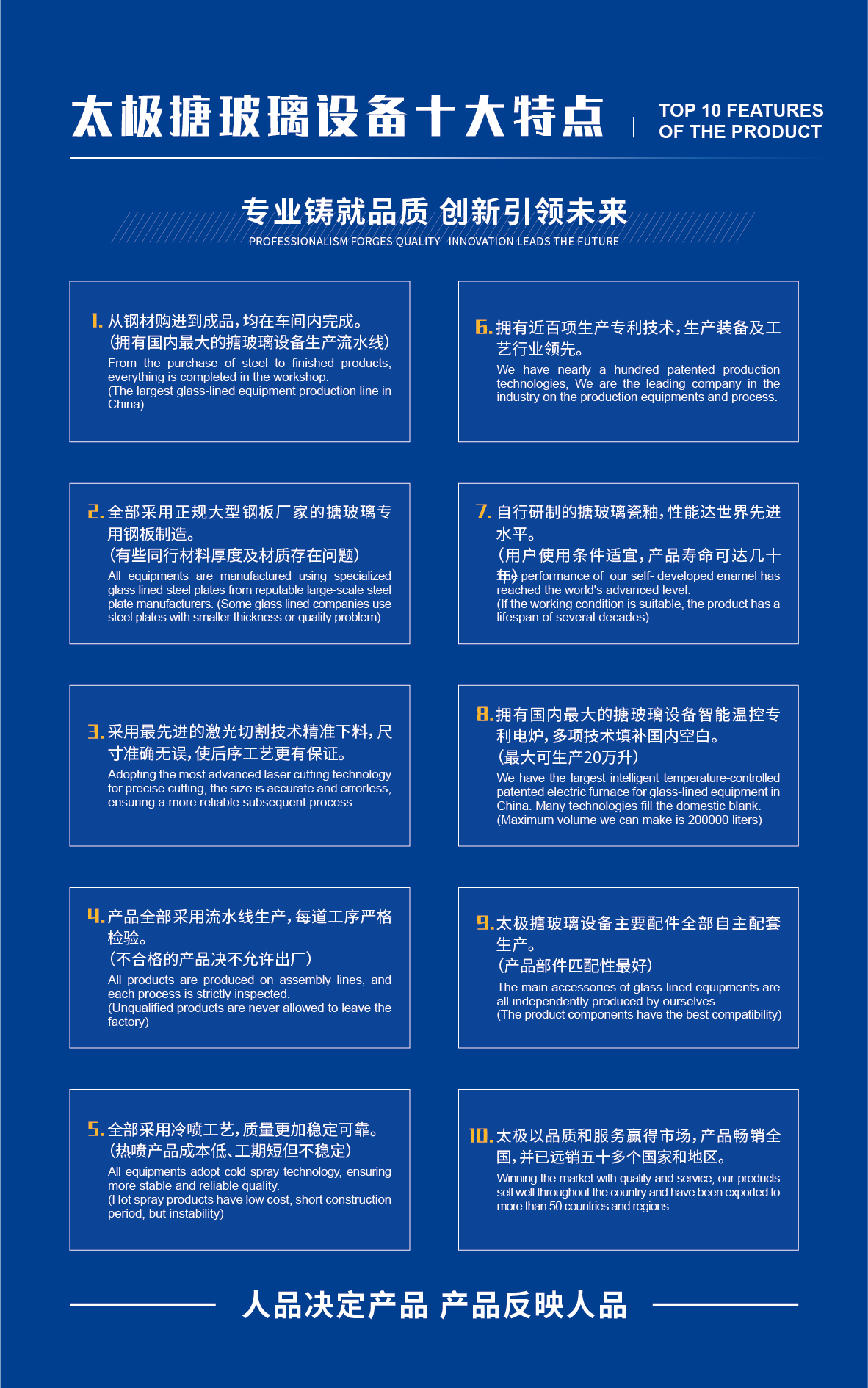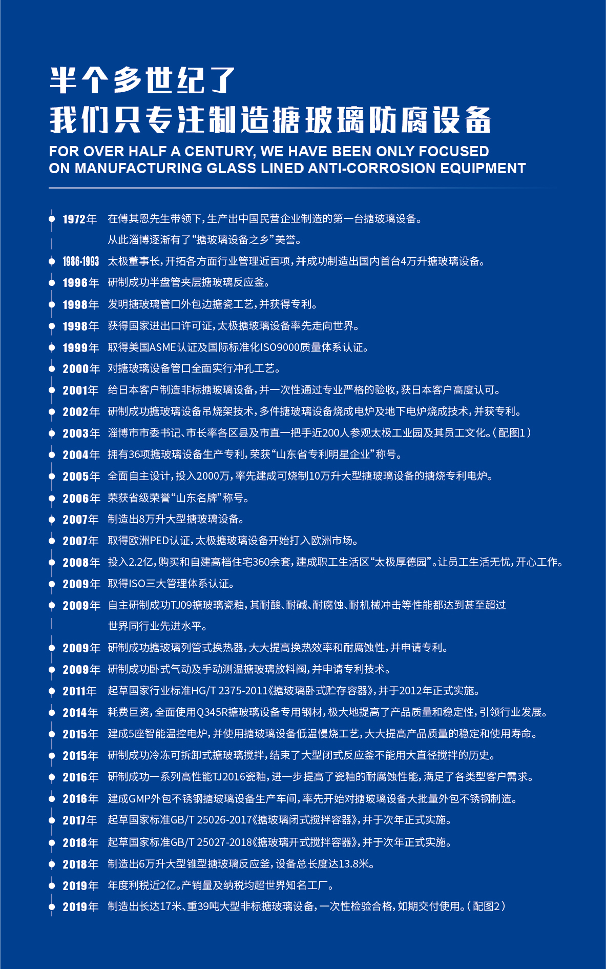 淄博太極在中國(guó)搪玻璃設(shè)備制造行業(yè)中首家通過ISO90001質(zhì)量體系認(rèn)證,并擁有美國(guó)ASME認(rèn)證、歐洲PED認(rèn)證以及國(guó)家部門頒發(fā)的搪玻璃制造許可證、進(jìn)出口許可證和百余項(xiàng)榮譽(yù)證以及三十六項(xiàng)專利等。